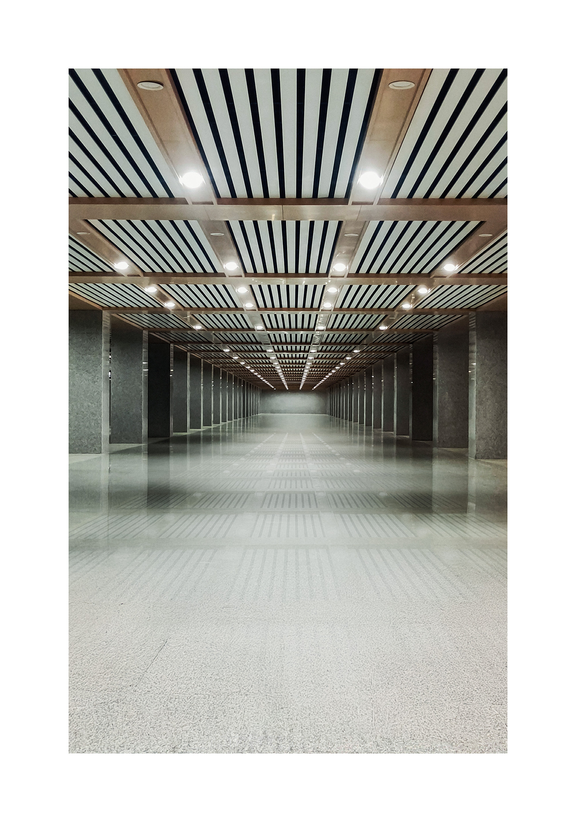 A print of a modern hallway with a reflective floor and a black and white striped ceiling with bright lights. The grey walls and symmetrical design create a clean, tunnel-like effect.