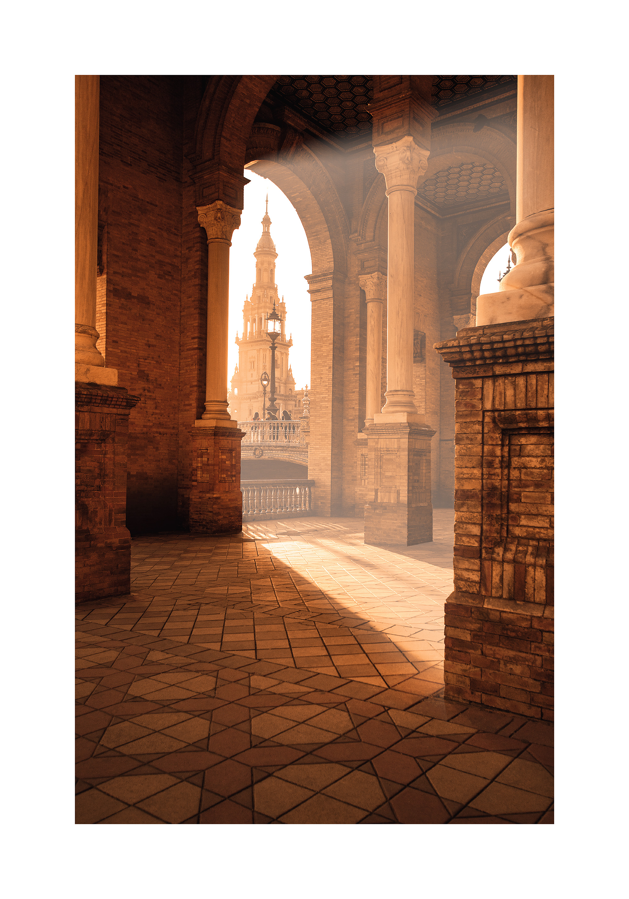 A print of tall stone columns and arches with beautiful details. Sunlight streams through, creating shadows on the patterned tile floor. Warm colours in orange and brown.