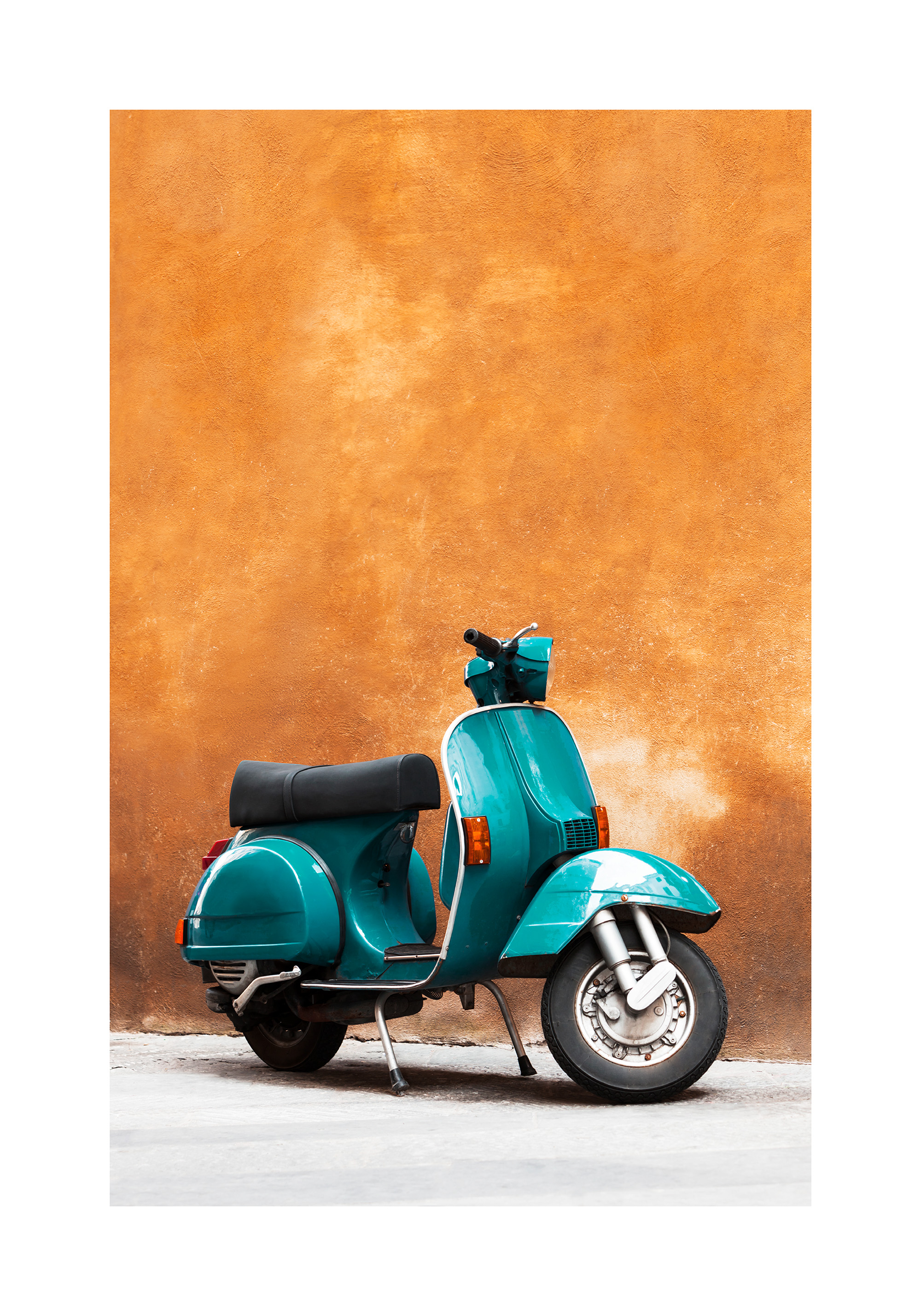 A print of a turquoise scooter with chrome details parked against a warm orange wall. Perfect wall art to bring a touch of Italy to your home.