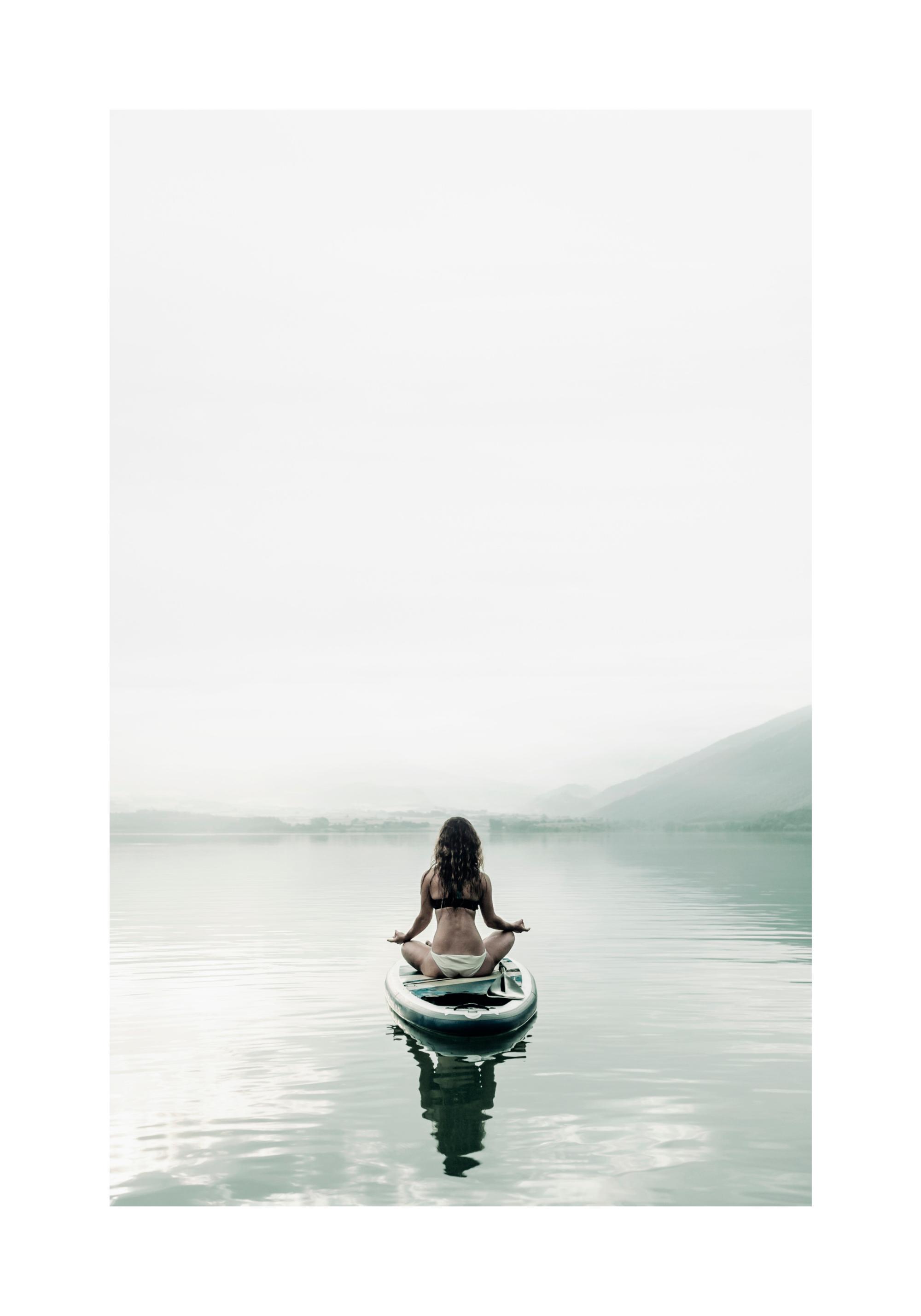 From $21.60Calming photography print with the motif of a woman who sits cross-legged on a canoe and meditates on the water. In the distance you can see mountains that frame the print gently. The sun is reflected in the water which gives the picture a peaceful atmosphere. The print has a printed white margin that frames the design.