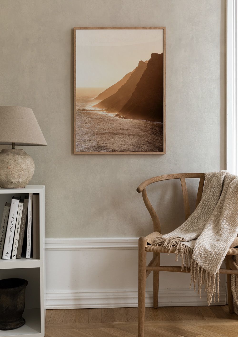 A print of a coastal scene with rugged cliffs silhouetted against a golden sky. The calm sea and warm sunlight create a glowing effect on the water and cliffs.