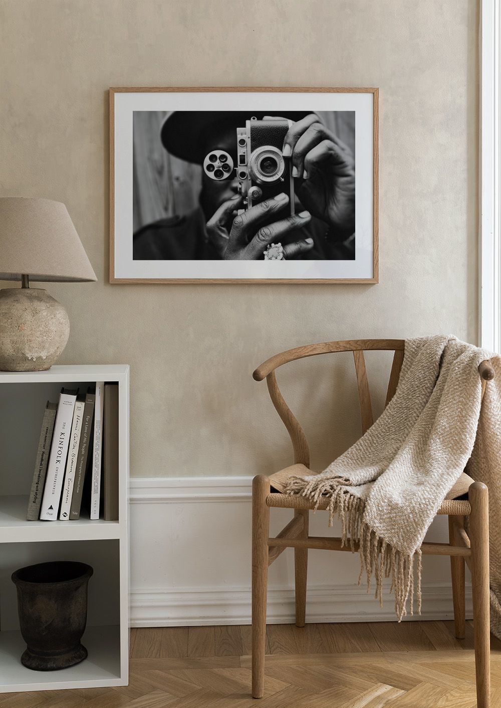 A black and white print of a person holding a vintage camera with a round lens and film reel against a wooden background.