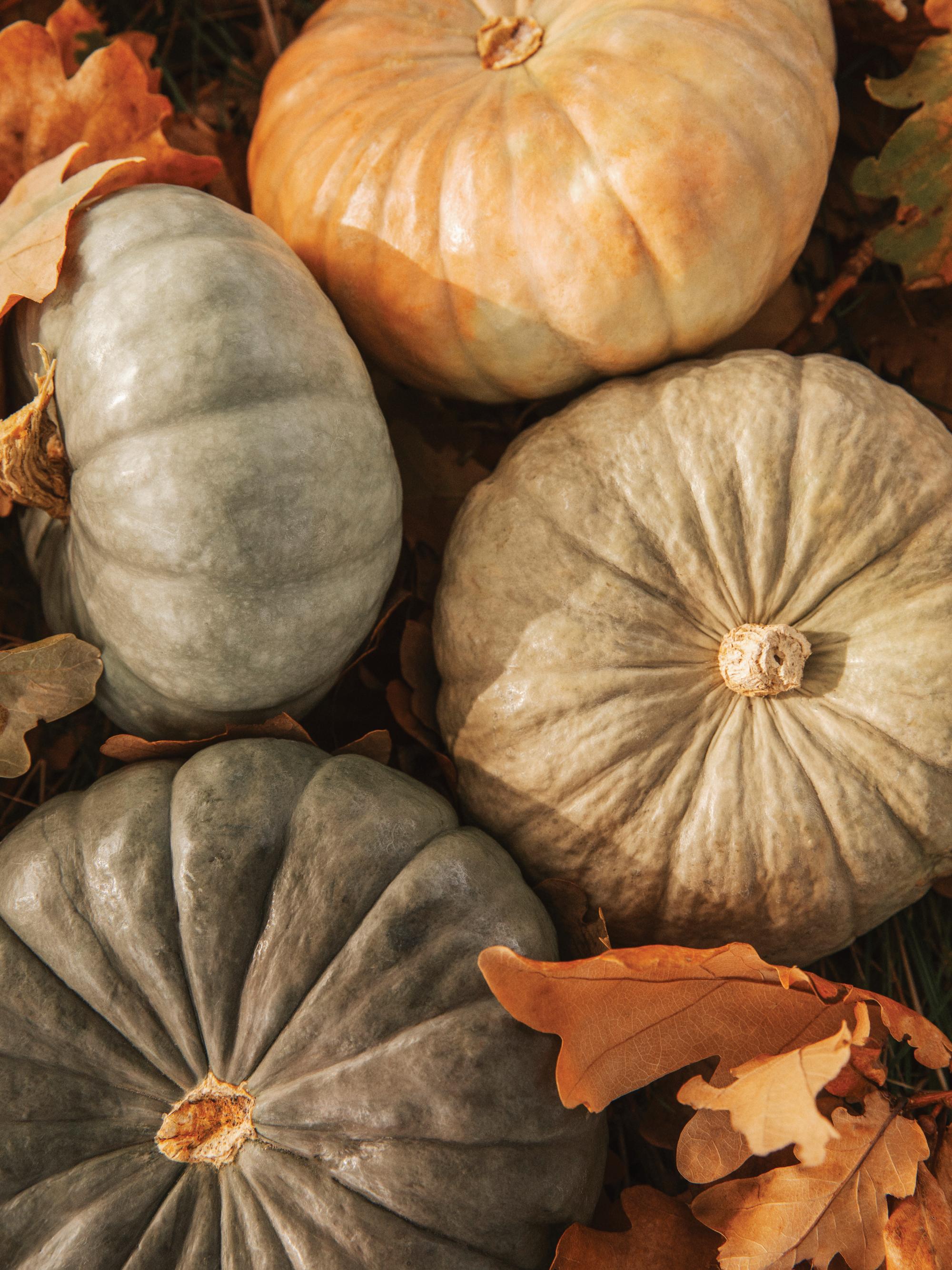 From $24A poster showing four pumpkins in orange and green, on a background of dried oak leaves.