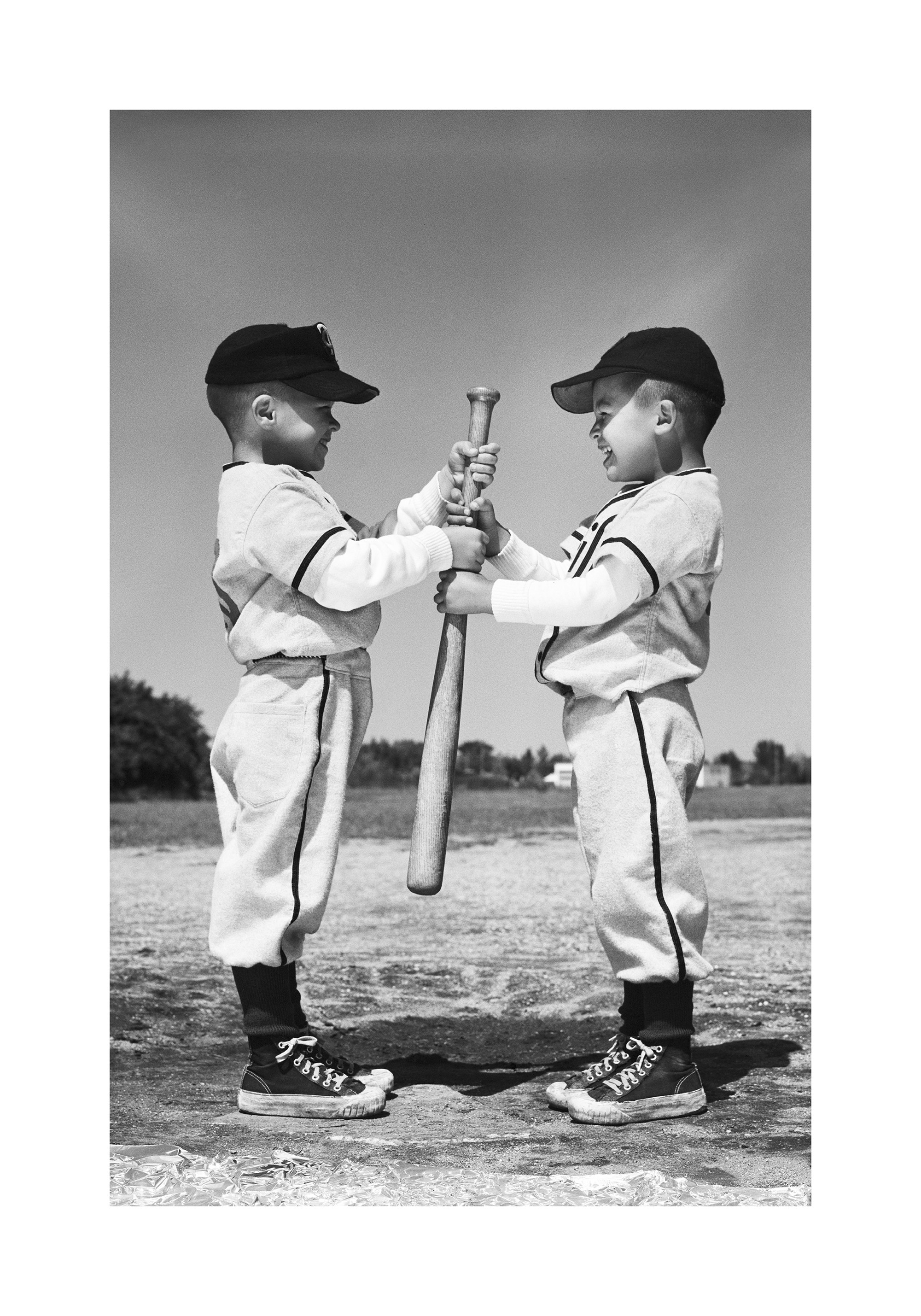 A black and white print of two boys in baseball uniforms holding a bat together on a dirt field.