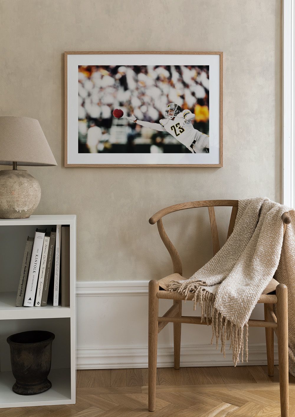An action-packed print of a football player in a white uniform diving to catch a red ball. Perfect wall art for sports fans!
