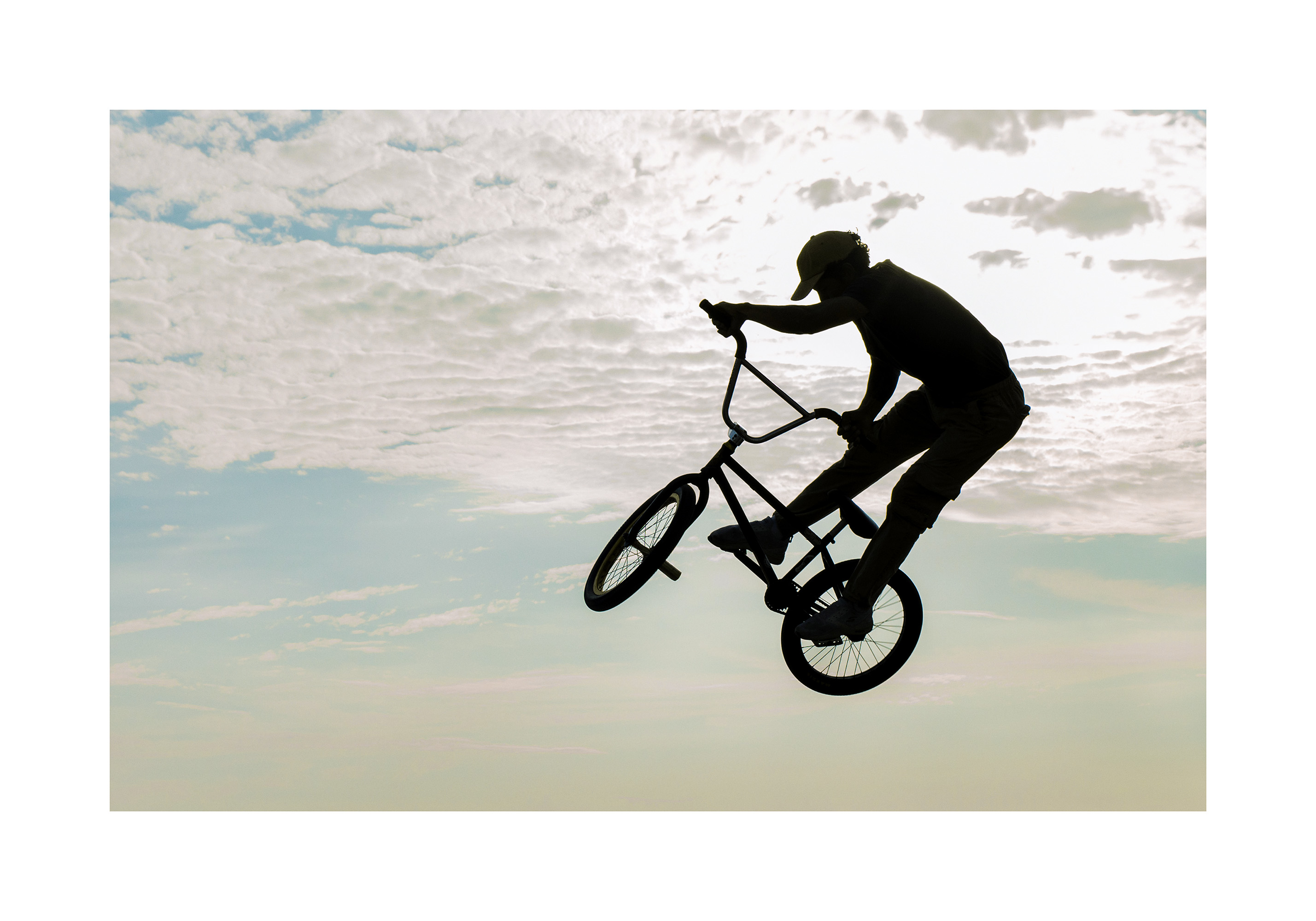 A print of a person on a bicycle jumping in mid-air against a bright blue sky. Perfect wall art for any sports enthusiast!