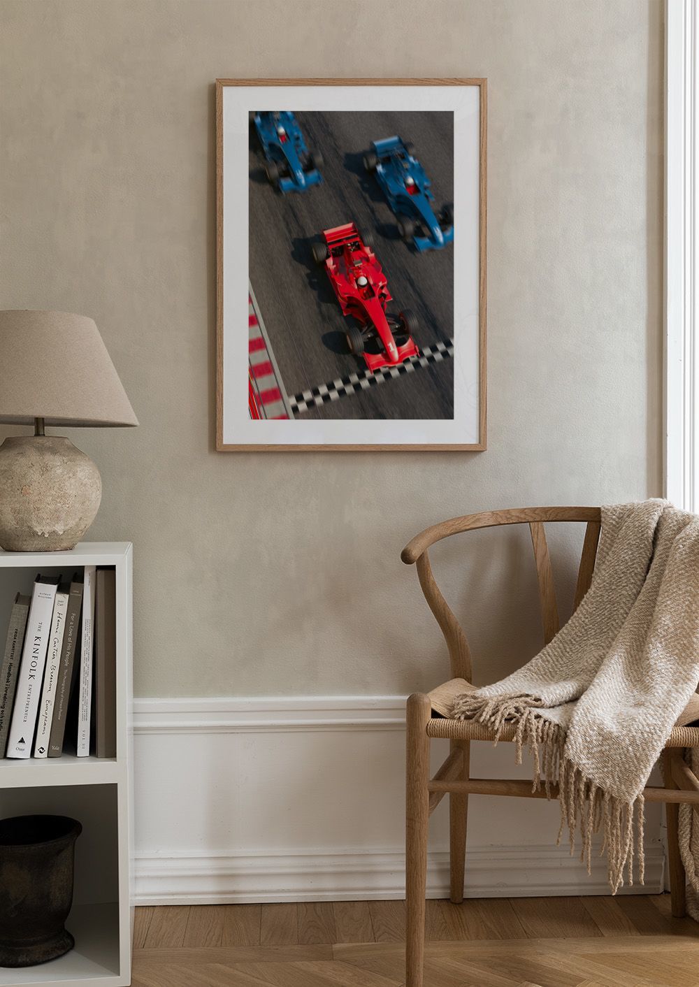A print of three race cars on a track. One red car with number 1 crosses the finish line, whilst two blue cars follow behind.