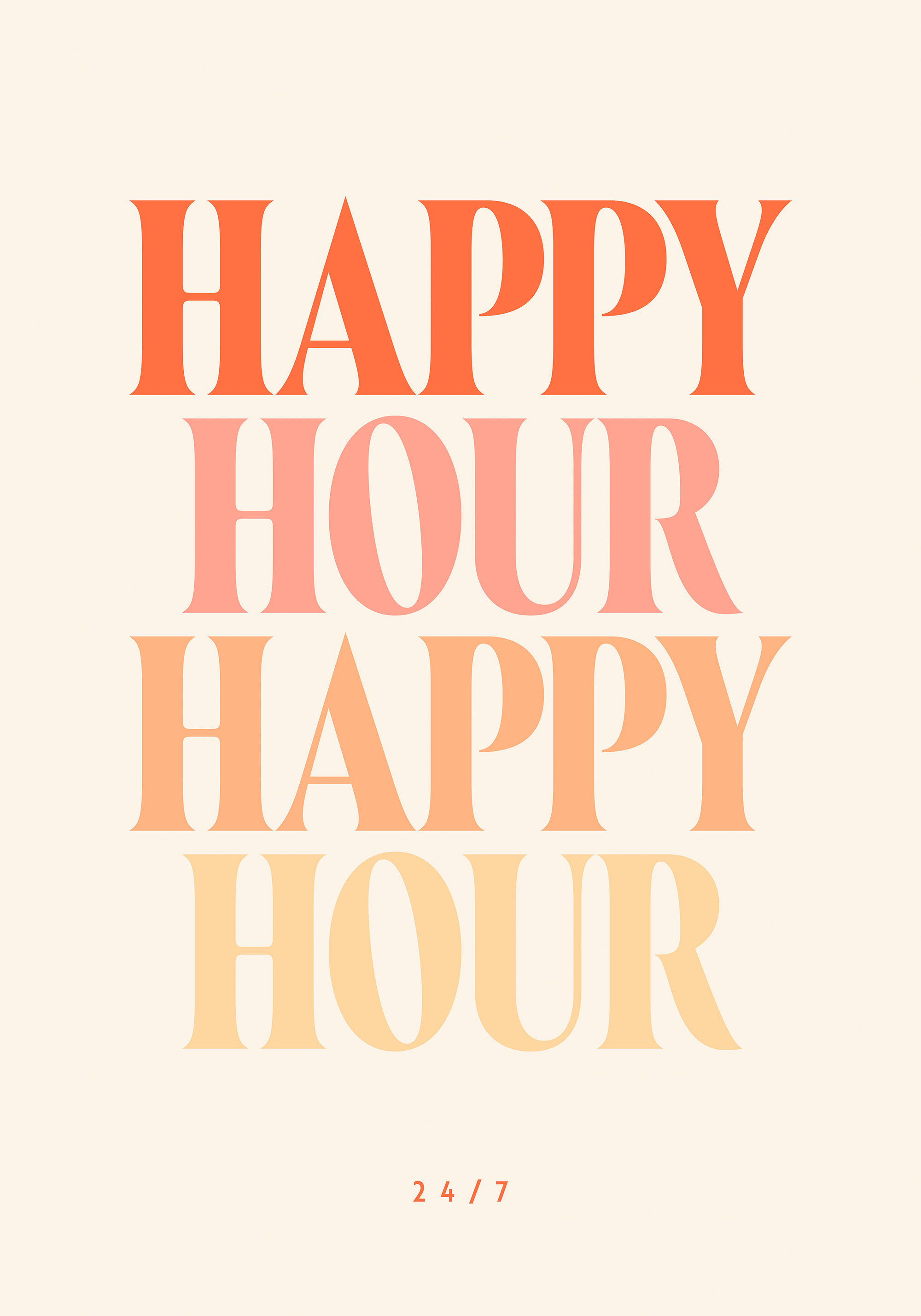 A retro print with "HAPPY HOUR" in bold letters with a gradient effect in shades of orange, pink, and peach on a light cream background.