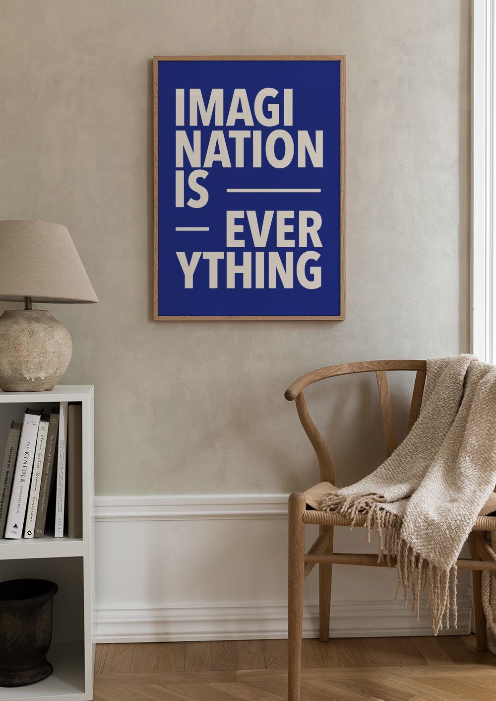 From $18A motivational print with white text on a dark blue background. Features the quote "Imagination is Everything" in bold, blocky letters.